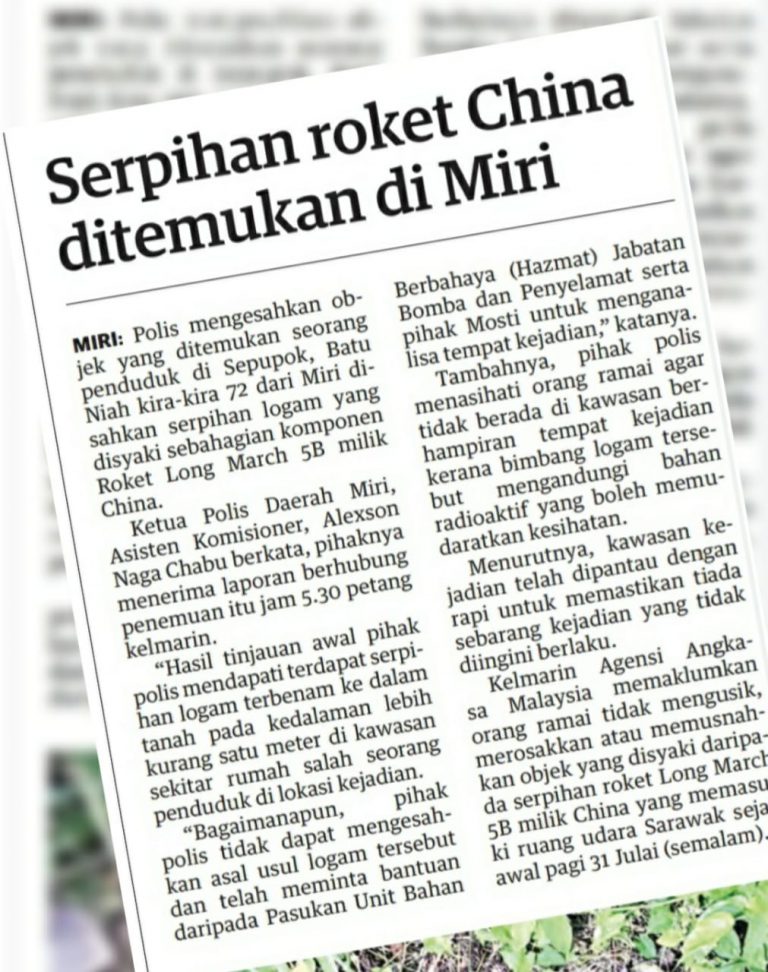 BINTULU: Just a day after a 14kg metal fragment believed to be debris from China’s Long March 5B rocket was found...